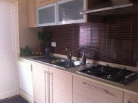 cozinha equipada com placa, forno, exaustor. moveis em madeira com bancada em granito. despensa.